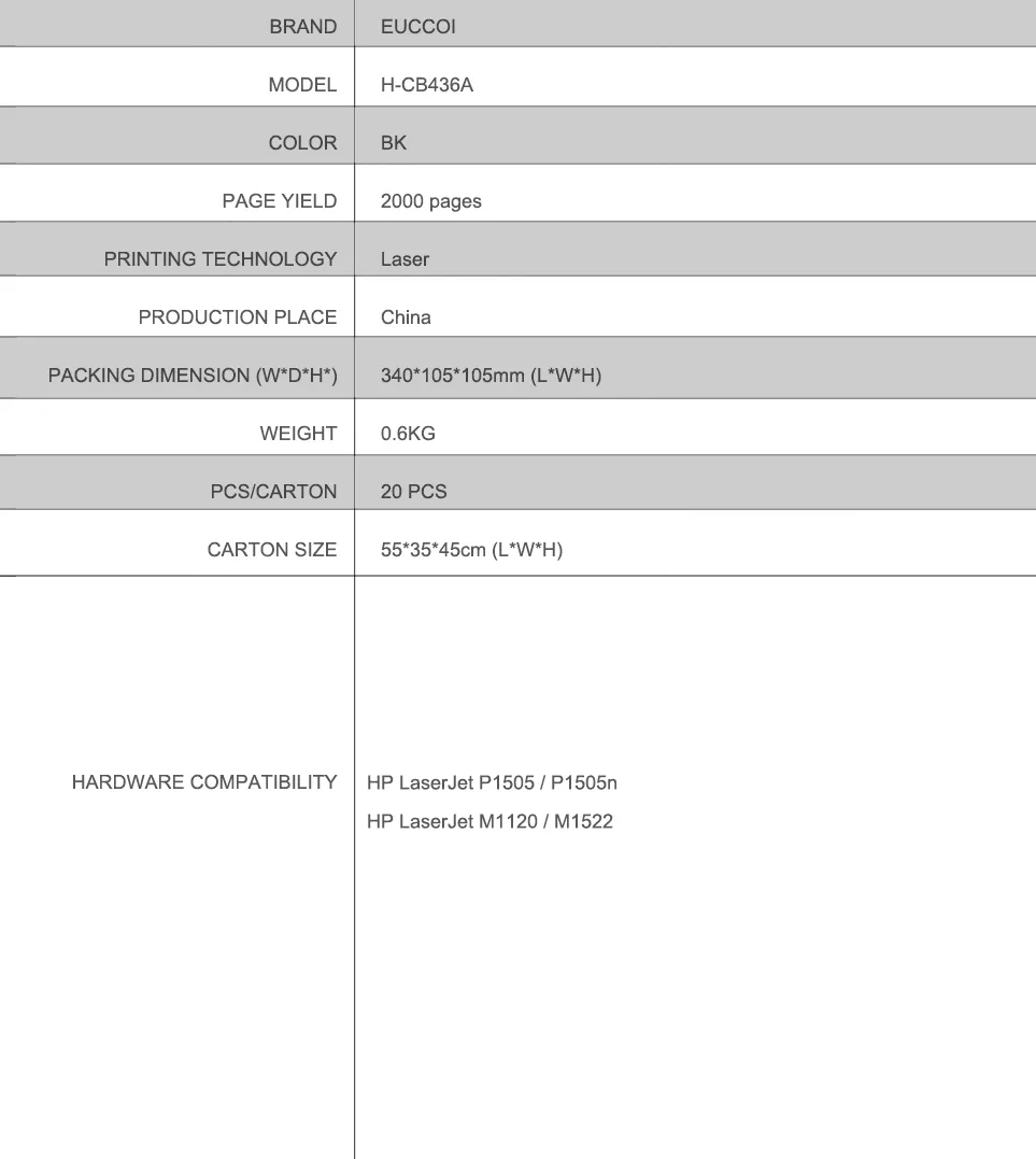 Model: EUCCOI CE278A/CE285A/CB435A/CB436A toner cartridge
